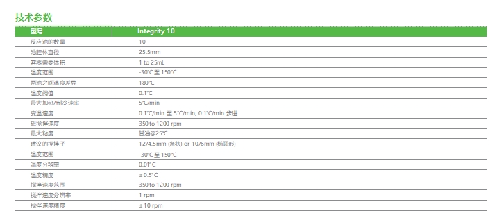 Integrity 10 多管平行反应工作站的实现了灵活性和精确性的高度结合: 您可以在一个系统里同时运行10个不同实验,您可以独立并 精确控制它们的温度和搅拌速度。您可以为每个独立实验设计不同的温度程序并记录下来:所有的结果也可以自动扑捉和记录,在 Cole-Parmer Integrity 10工作时,您可以去从事其他工作(甚至休息)。